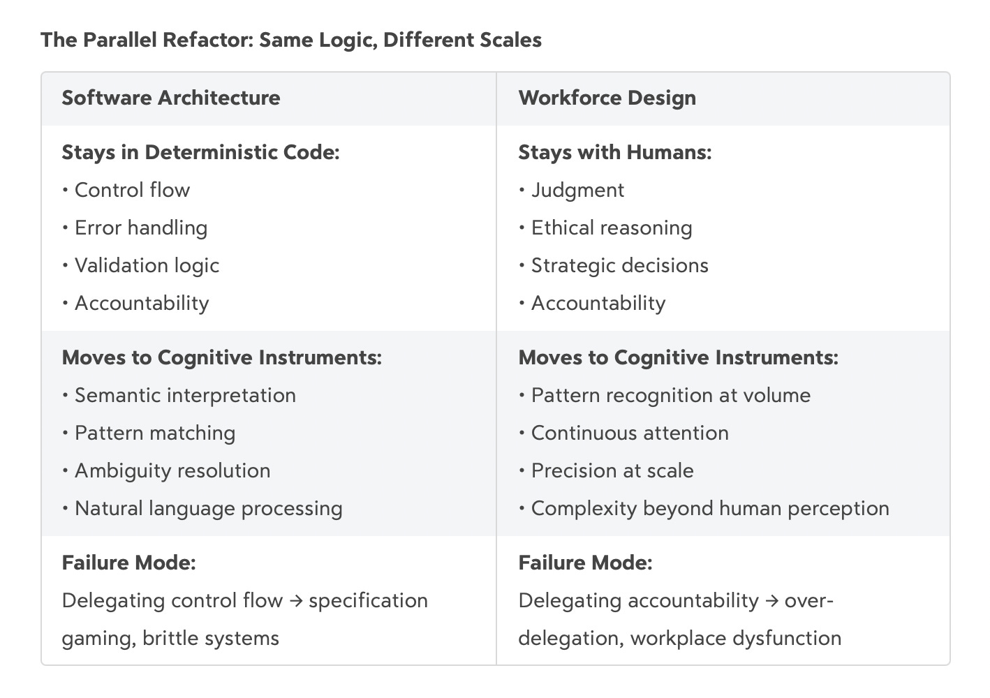 The parallel is exact. Software refactoring asks: what stays in deterministic code (accountability, control flow) versus what moves to cognitive instruments (interpretation, semantic processing)? Workforce refactoring asks: what stays with humans (judgment, accountability, meaning) versus what moves to cognitive instruments (scale, complexity, continuous attention)?