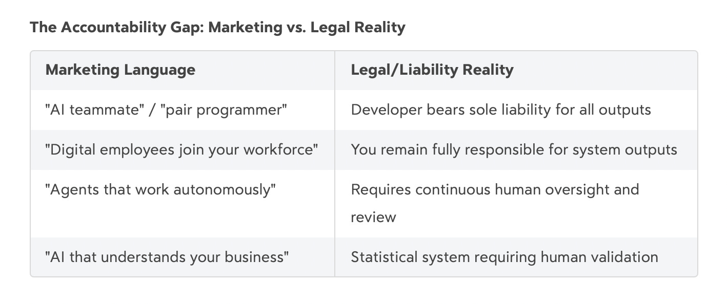 The vendors selling “autonomous AI agents” and “digital workers” know this. Their terms of service make it explicit—you remain fully responsible for outputs. But the marketing language systematically obscures this reality, creating exactly the category confusion that leads to over-delegation, catastrophic failures, and workplace dysfunction.