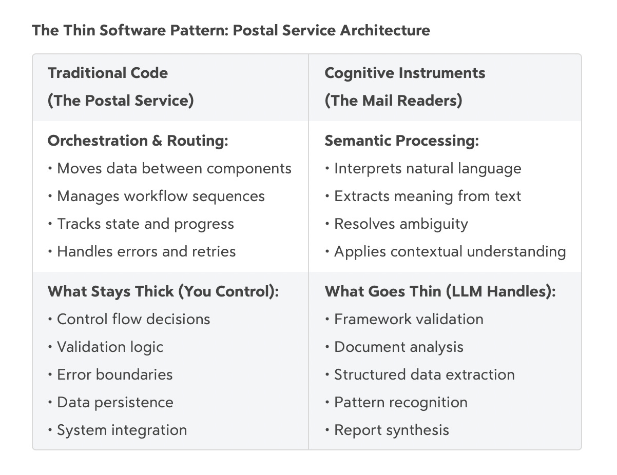 Instead, I adopted what I started calling a “Thin Software” approach for my own design clarity: software handles orchestration and routing, but anything requiring interpretation or parsing gets delegated to an LLM. The orchestration/execution separation is standard architecture, but the decision boundary—when to use deterministic code versus statistical inference—felt new. Think of it as a postal service metaphor: software moves packages and manages logistics, but when you need to “open the mail and read it,” that goes to the cognitive instrument.